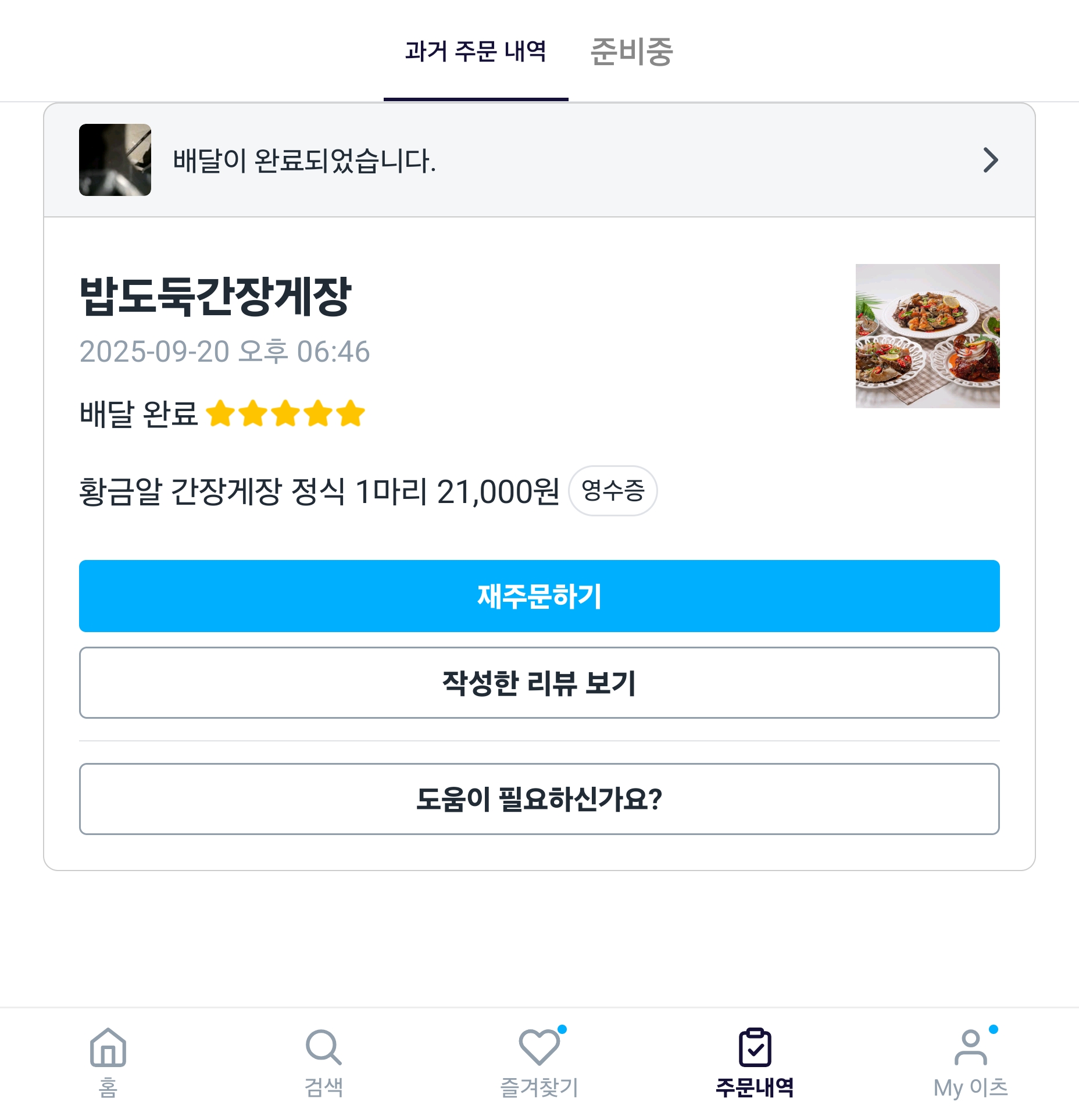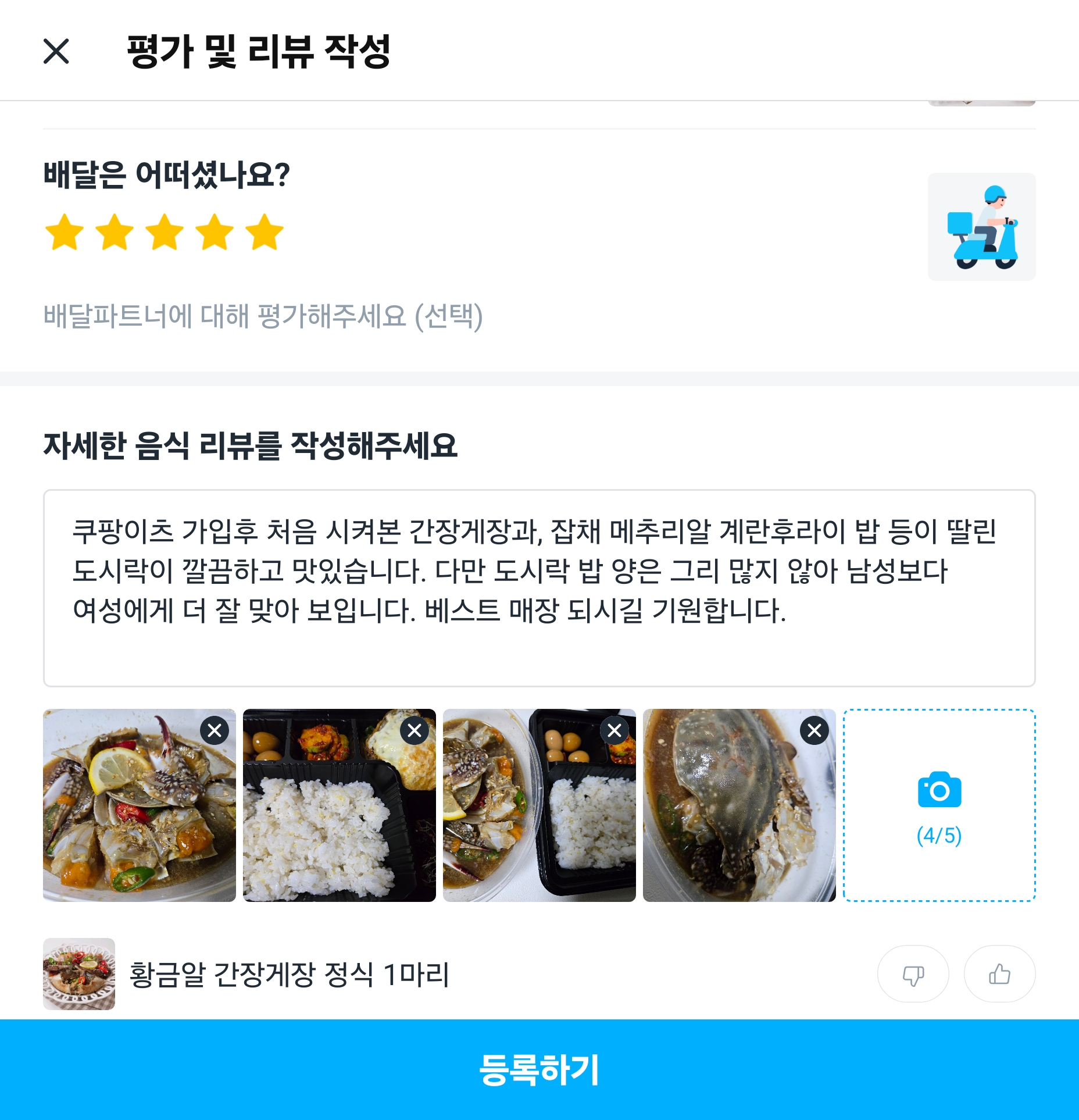 황금알 간장게장 정식1마리가 쿠팡에 보이길래 쿠팡이츠 앱도 깔고 첫주문 12,000원 할인도 있길래 2만1천원에 주문해 보았다. 꽃게 1마리랑, 밥 오이 잡채 계란후라이 메추리알 등이 담긴 도시락이 0.9킬로 떨어진 밥도둑 간장게장 매장에서 29분만에 왔다. 깔끔하고 좋아 리뷰도 좋게 남겨줬지만 도시락 밥 양이 많지 않아 여성용으로 더 좋은듯 하였다. 무료배달이라 월8천원 와우멤버쉽도 가입 했는데 주말 먹거리 다변화를 위해 잘 활용해 볼 생각이다.