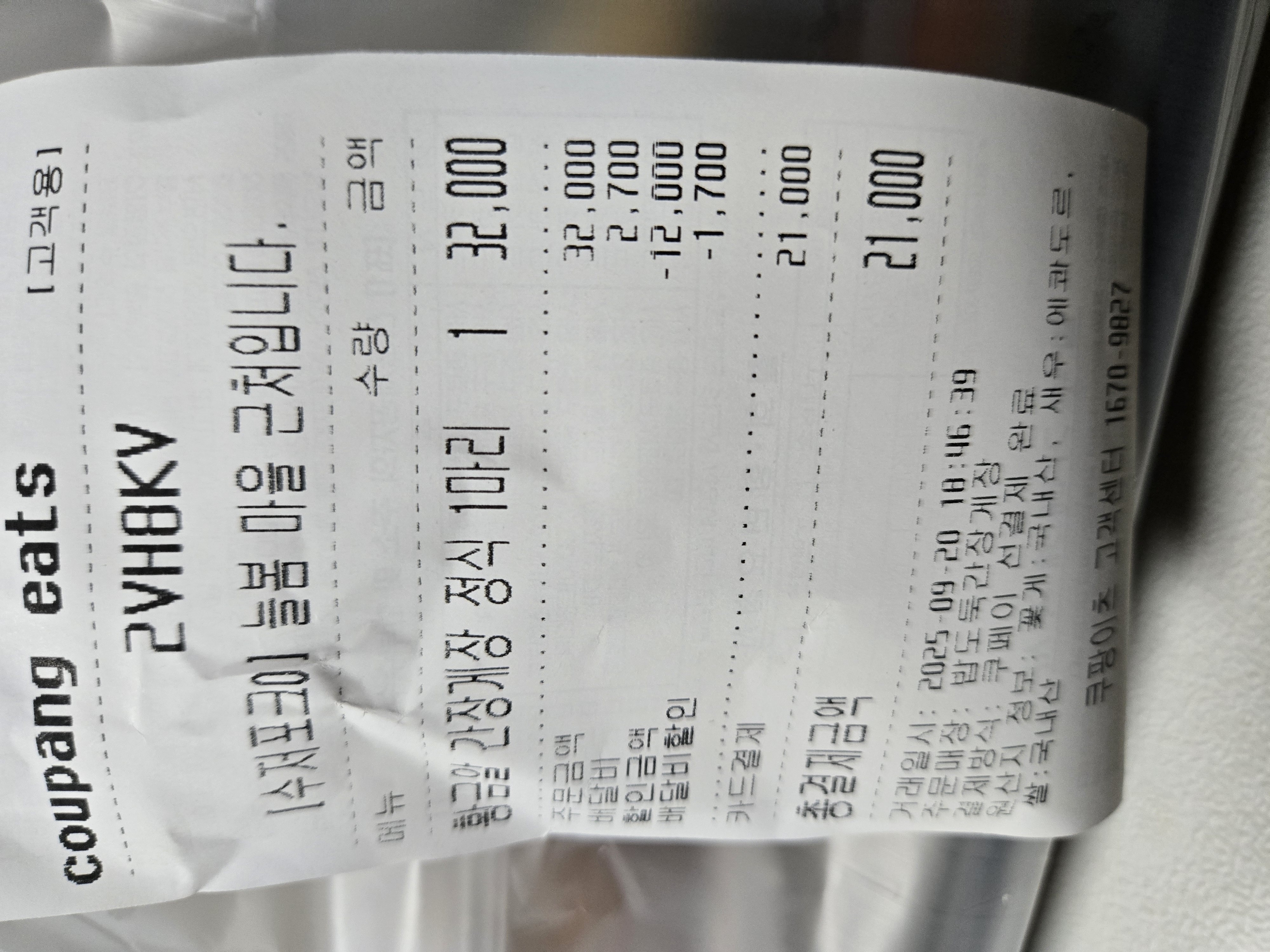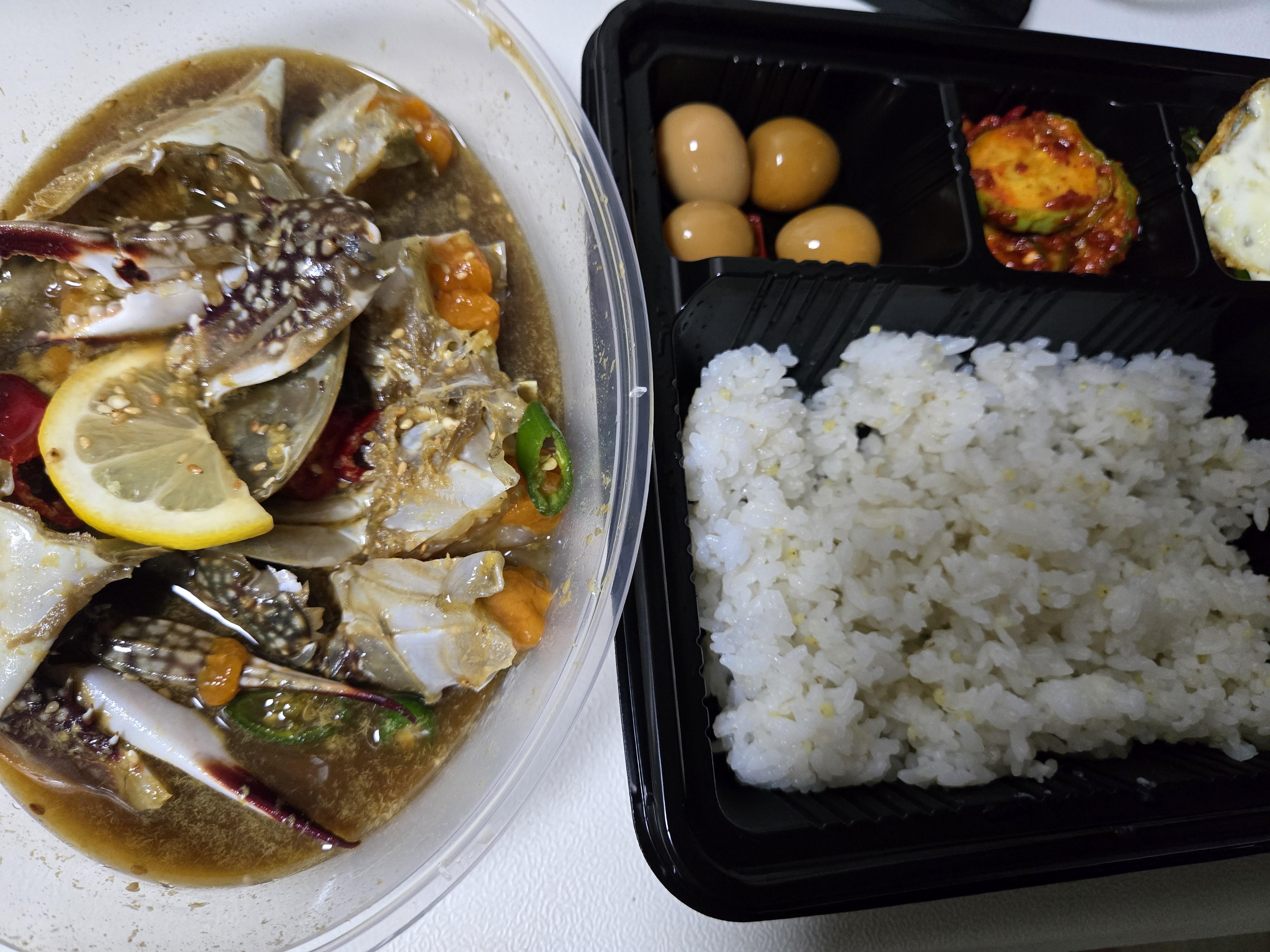 I saw the “Golden Egg Soy Sauce Marinated Crab Set (1 crab)” listed on Coupang, so I downloaded the Coupang Eats app. Since there was also a ₩12,000 first-order discount, I decided to try it for ₩21,000. The lunchbox, which came with one whole crab, rice, cucumber, japchae, a fried egg, quail eggs, and more, was delivered from the Rice Thief Soy Sauce Crab restaurant just 0.9 km away in only 29 minutes.