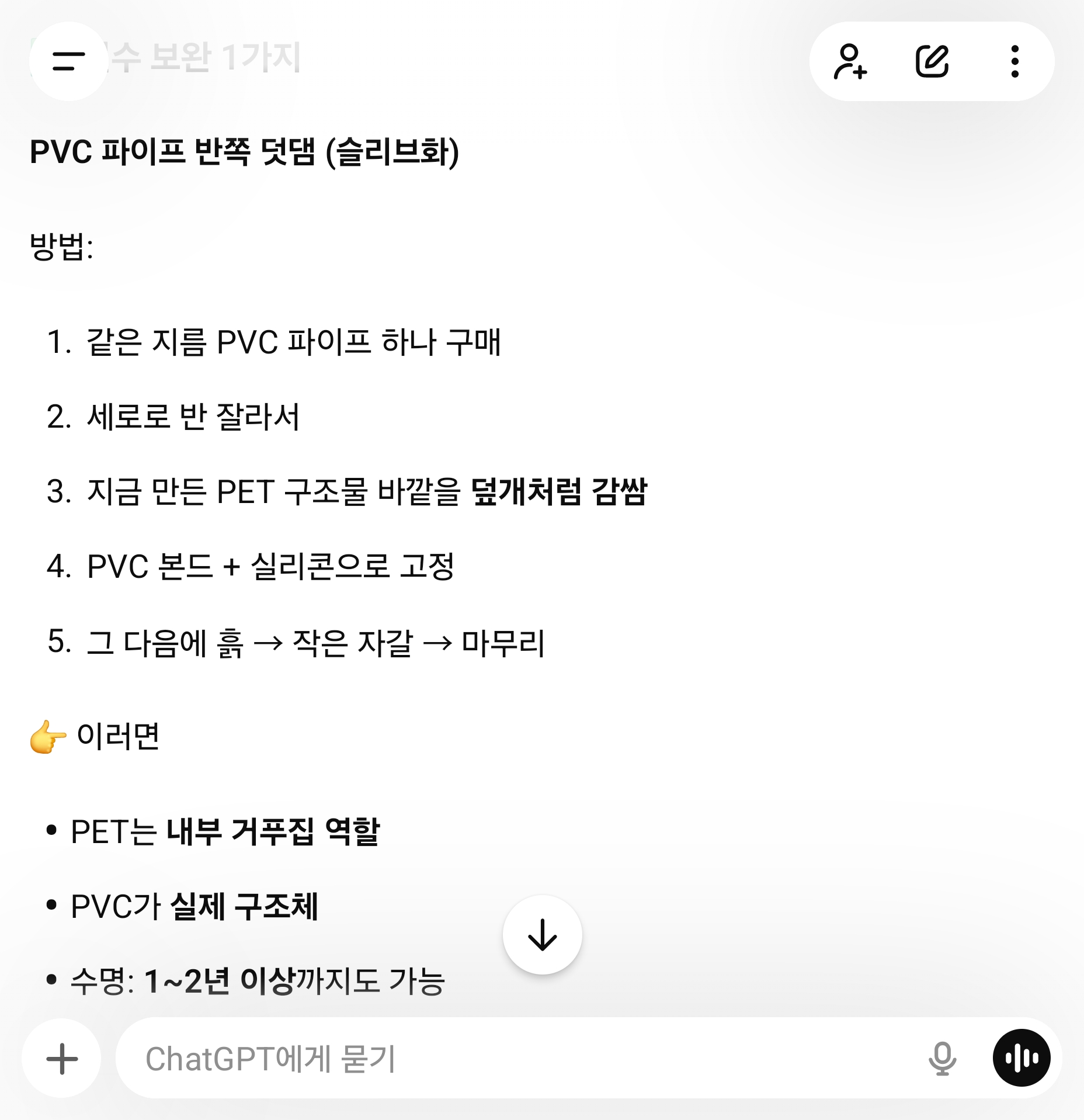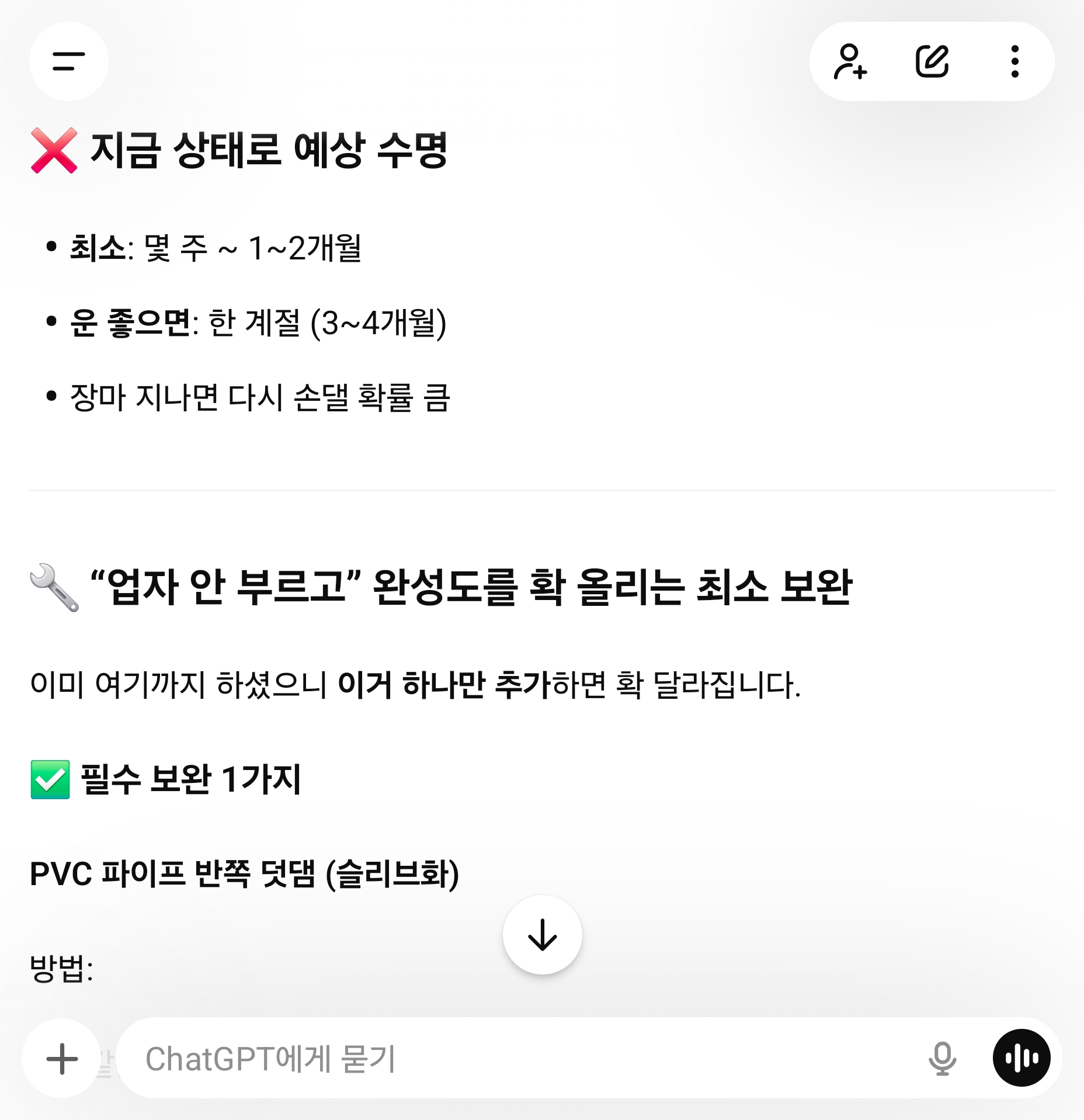 ㅡ 인공지능 챗지피티가 본 배수관 셀프복구 점수ㅡ70점이라고 한다. 몇달은 지켜보기로. #AI #인
