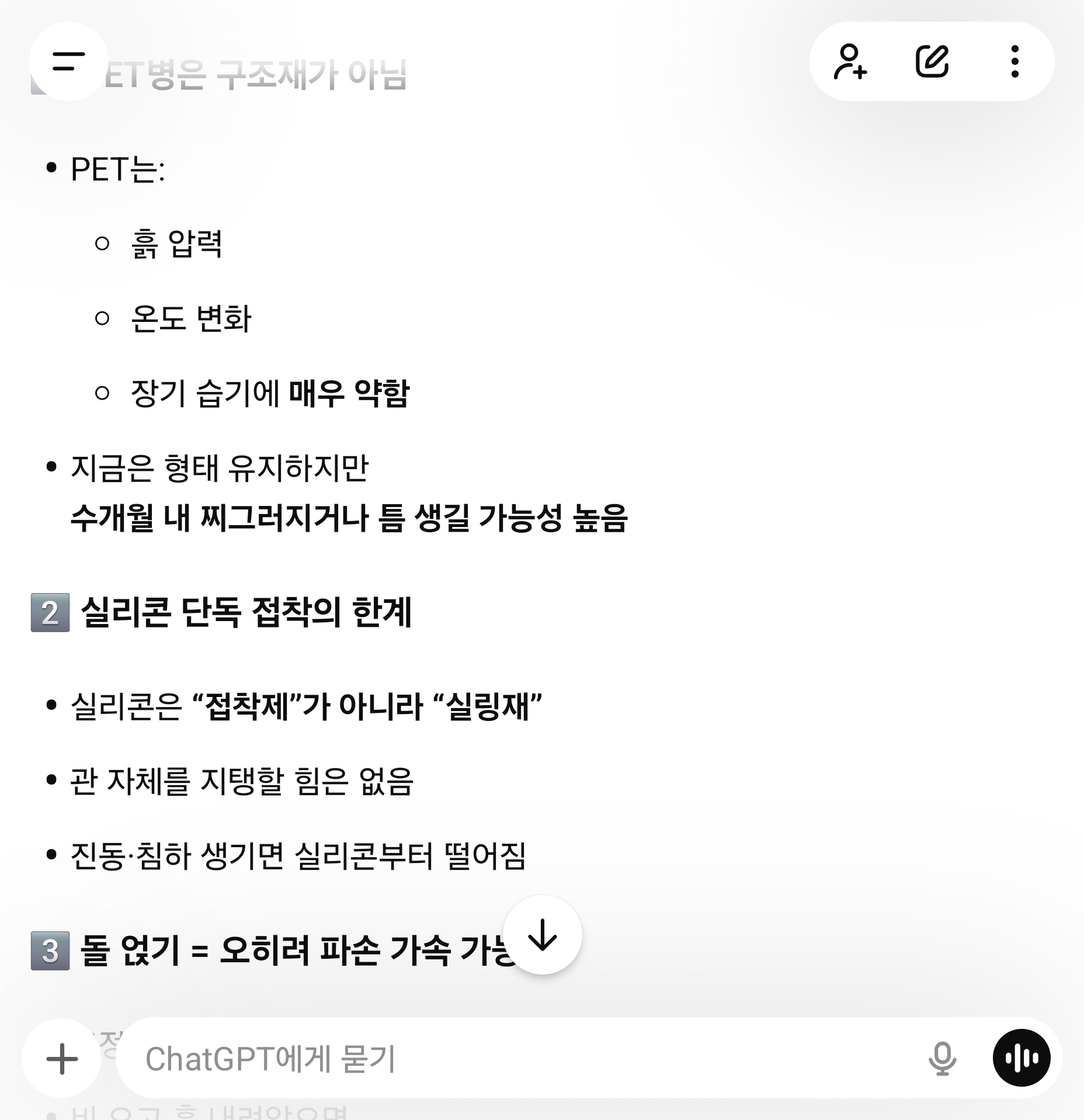 인공지능 챗지피티는 복구사진 4장을 분석하더니 70점이라고 한다. 물길 만든건 좋으나 피티병이 약하다는 것. 그래서 2호라인(102,202,302,402)분들에게 생활하수로 뜨거운 물 버리지는 말아달라고, 온수세탁은 자제해 달라고 해야할 것 같다. 인공지능은 통찰력(insight)을 얻는덴 좋으나 현장감은 떨어진다. 그래도 더나은 저렴한 대안도 찾아보고 있으니, 일단 몇달은 지켜보기로. #AI #인공지능 #챗지피티 #배수관 #셀프복구